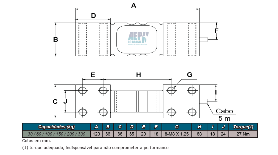 Fabricada em aço liga, é destinada a aplicações em balanças com prato diretamente conectado à uma única célula de carga (balanças comerciais, balanças industriais, balanças ensacadoras e máquinas em geral).